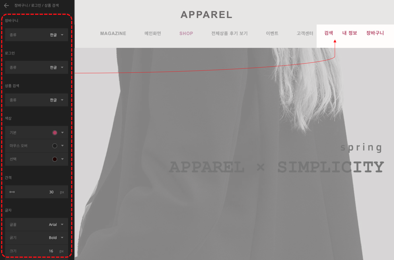 쇼핑몰 디자인의 핵심인 스타일 편집 기능은 주로 글꼴 설정, 색 변경 등 눈에 보이는 디자인 위주의 설정을 일괄적으로 담당합니다. 섹션이나 요소의 태그 부분에 있는 팔레트 모양 아이콘이나 스타일 편집 메뉴를 통해 설정할 수 있습니다.