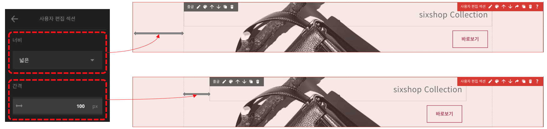 사용자 편집 섹션에서, 요소를 통해 공백을 추가한 경우 개별 편집을 사용하여 여백 (높낮이)을 설정할 수 있어요. 개별 편집으로 수정하거나, 공백 요소를 클릭 후 마우스 드레그로 수정할 수 있어요.