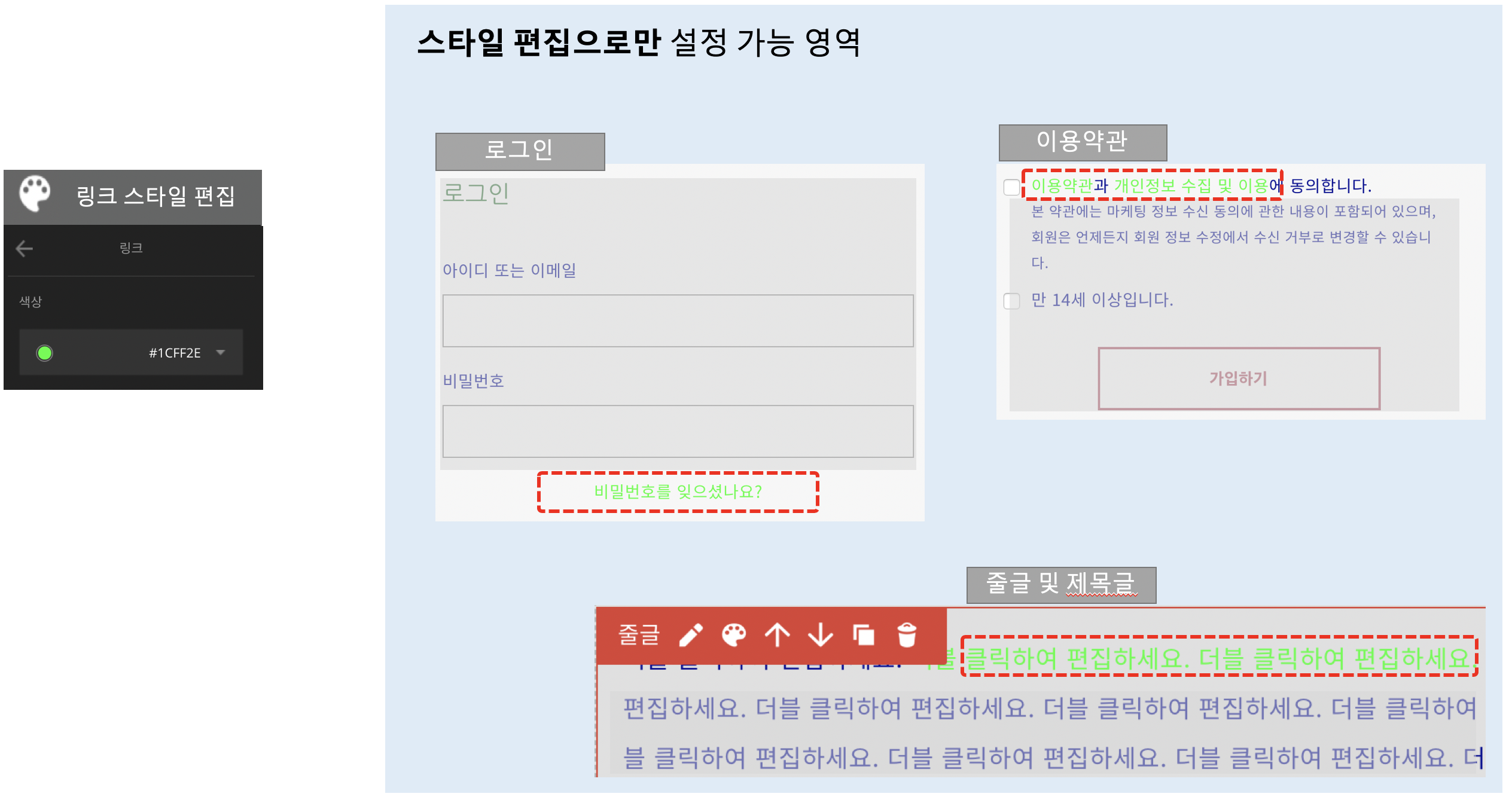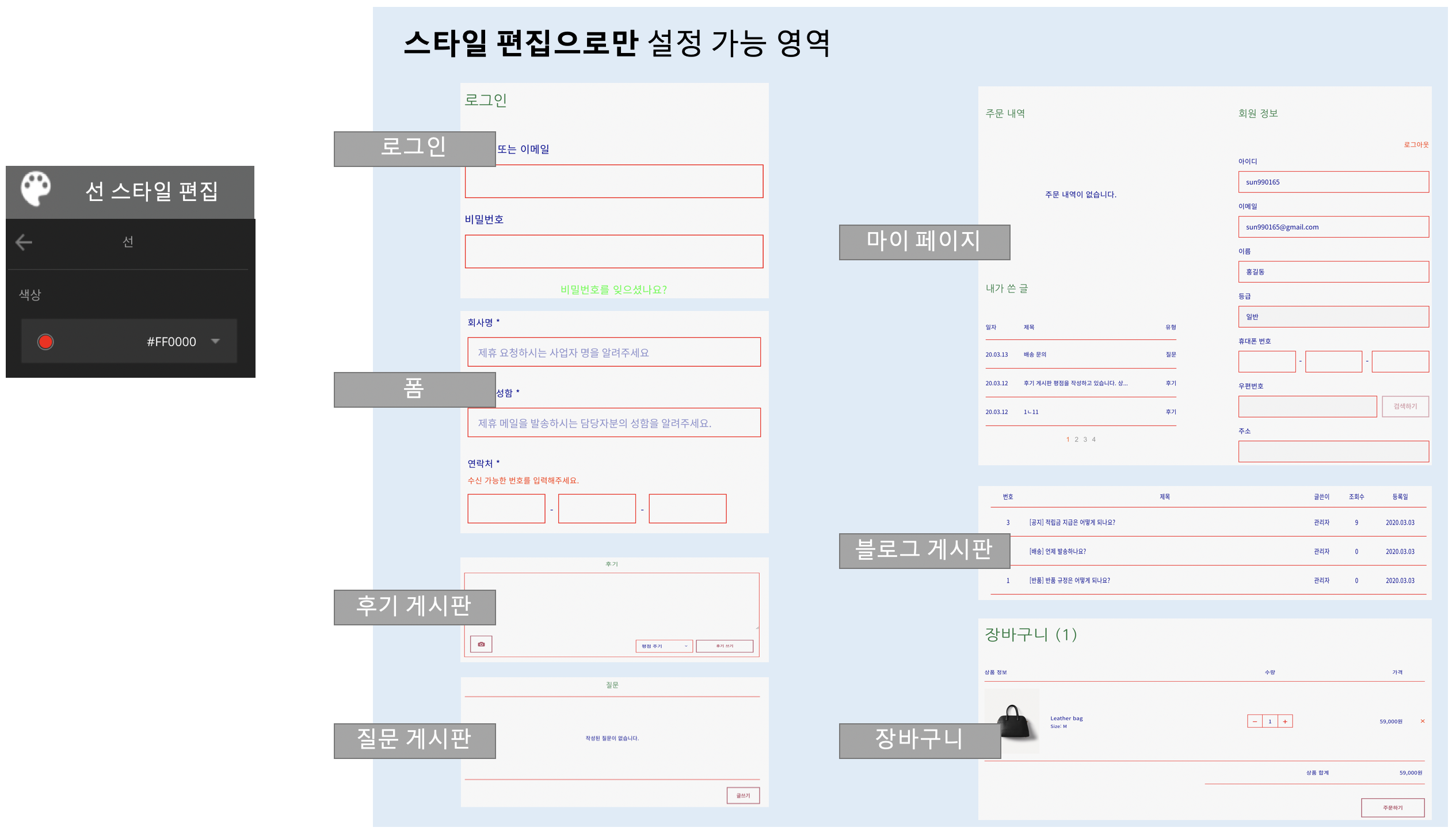 스타일 편집은 크게 4개의 영역을 기준으로 28개 구성품 (섹션 및 요소)의 디자인을 관리할 수 있고 동일 구성품(섹션 & 요소)에 일괄적으로 디자인을 적용 할 수 있습니다.