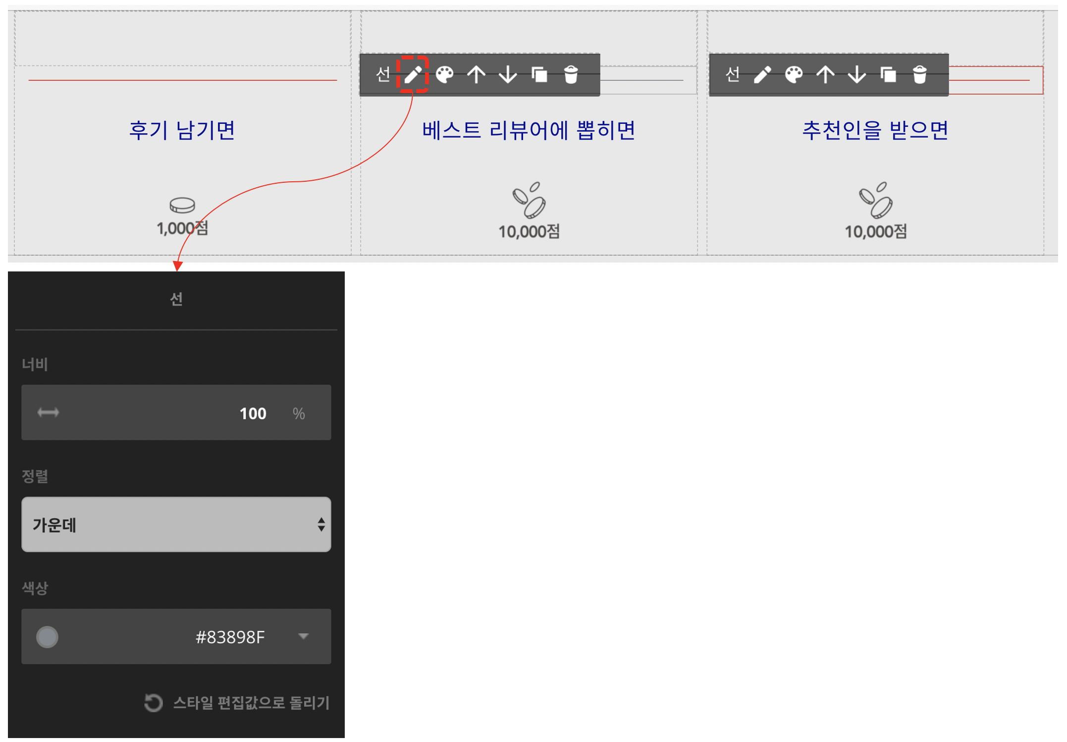 개별 편집 > 스타일 편집 의 우선 순위로 디자인 설정 값이 지정되는데요. 사용자가 직접 변경한 사항을 기본값으로 되돌리고 싶을 경우, 각 패널에 보이는 버튼을 통해 되돌릴 수 있습니다.
