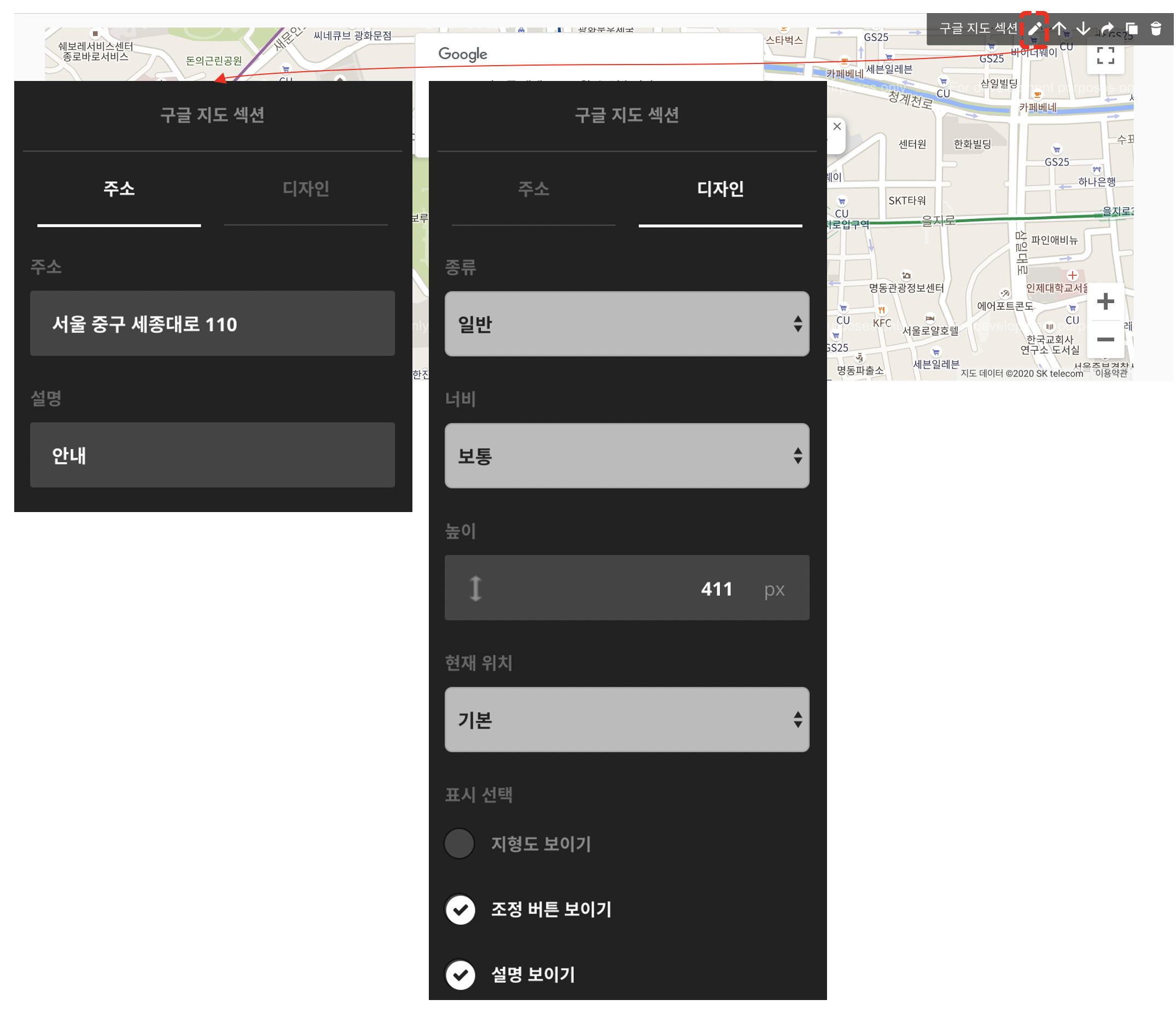 스타일 편집에서 설정한 디자인과 별개로 개별 편집을 통해 해당 요소만 디자인을 다르게 수정하거나 스타일 편집에 없는 기타 설정(이미지 너비, 구글 지도 주소 값 등)을 적용할 수 있습니다. 태그의 연필 모양 아이콘이나 더블 클릭으로 설정할 수 있습니다.