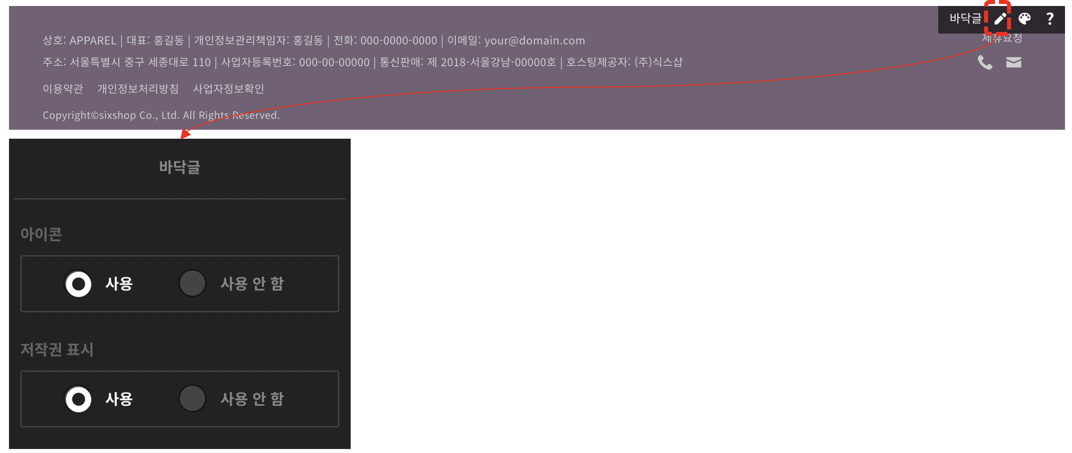 바닥글 항목 중 2가지의 사용 여부를 설정할 수 있어요.(저작권 표기, 아이콘)