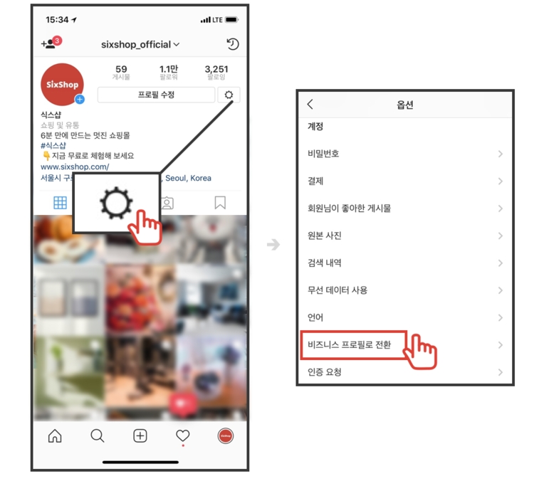2. 페이스북 비즈니스 계정 보유, 상품 등록이 완료되면 인스타그램 계정을 비즈니스 프로필로 전환하고 승인을 기다린 뒤 3번 단계를 진행합니다.