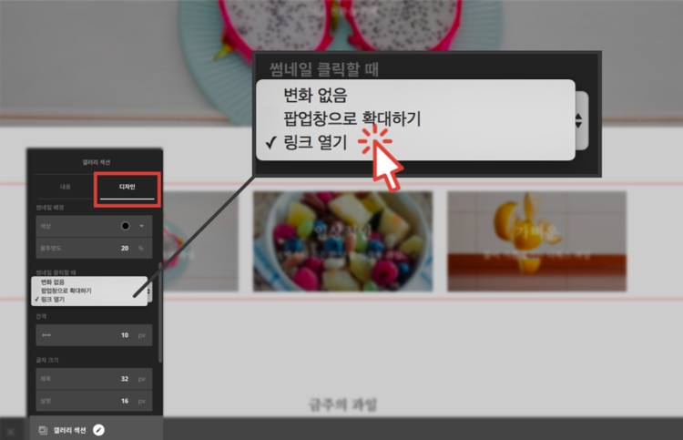 3. '디자인' 탭에서 '썸네일 클릭할 때' 설정을 '링크 열기'로 선택하고 이동할 페이지를 설정합니다.