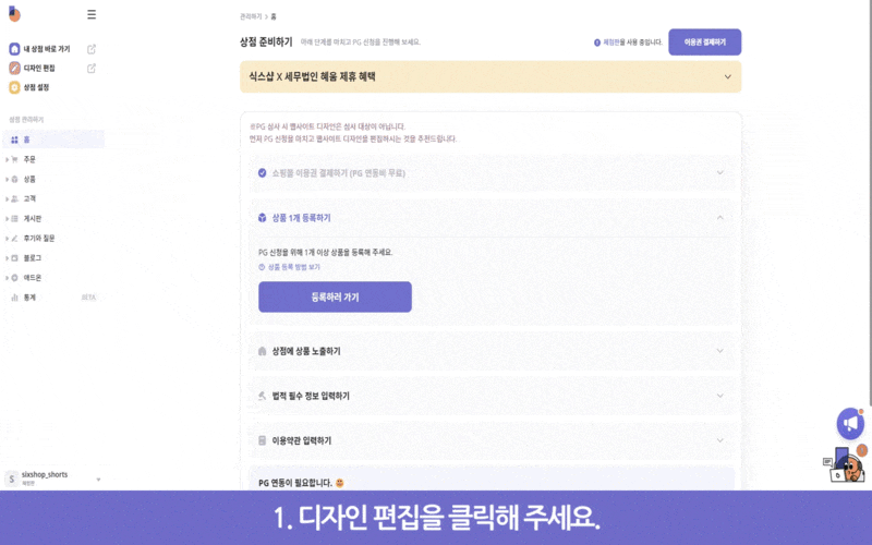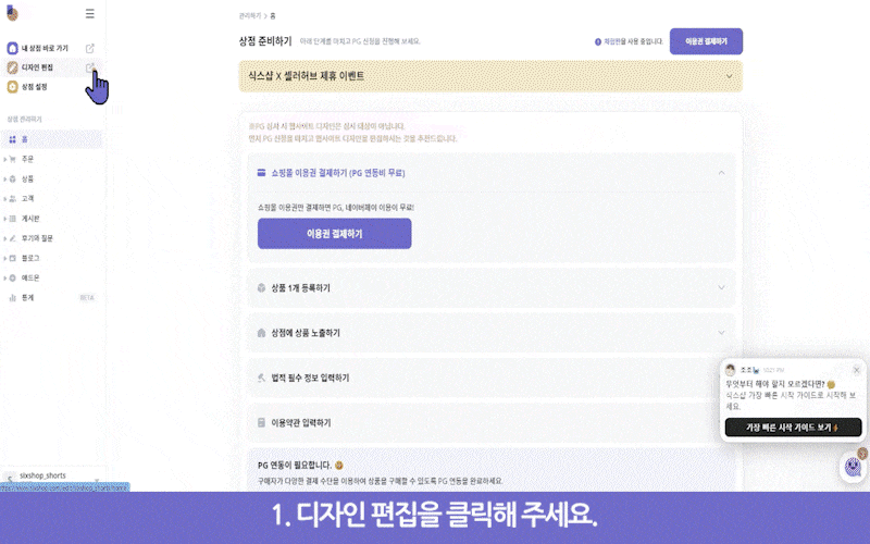 1. 식스샵 로그인 후 왼쪽 위의 ‘디자인 편집’ 클릭