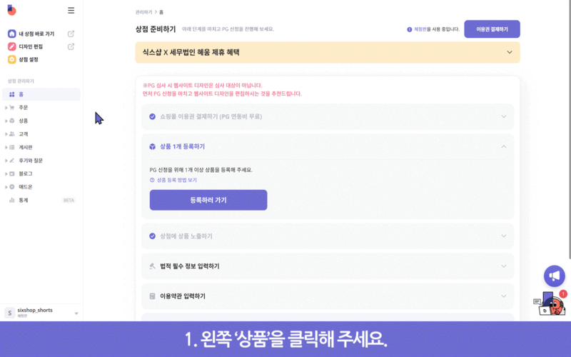 1. 식스샵 로그인 후 왼쪽 '상품' 클릭