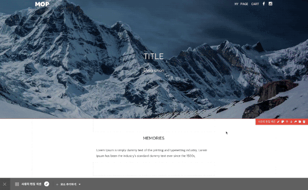 페이지 내 콘텐츠를 직접 구성하고자 할 때 빈 섹션 안에 다양한 요소를 직접 추가하여 사용할 수 있으며, 상점 웹사이트 디자인 시 가장 많이 활용됩니다.