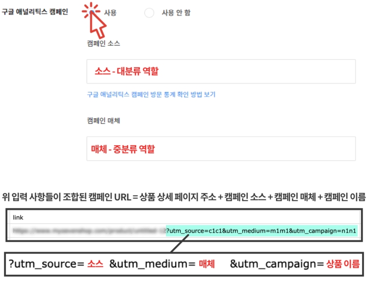 1. [관리하기 > 애드온 > 네이버 쇼핑 / 다음 쇼핑하우 / 페이스북 카탈로그]에서 구글 애널리틱스 캠페인을 '사용'으로 체크하고 각 항목을 입력합니다.