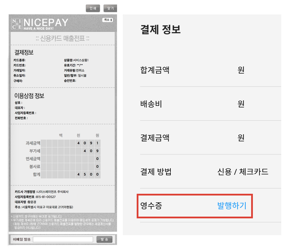 주문 결제 정보에서 영수증을 발행할 수 있습니다.