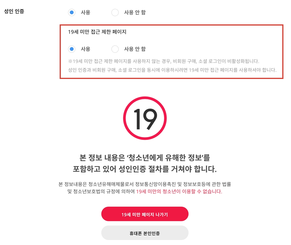 [관리하기 > 애드온 > 본인 인증]에서 성인 인증을 '사용'으로 설정하면, 19세 미만 접근 제한 페이지를 이용할 수 있습니다.