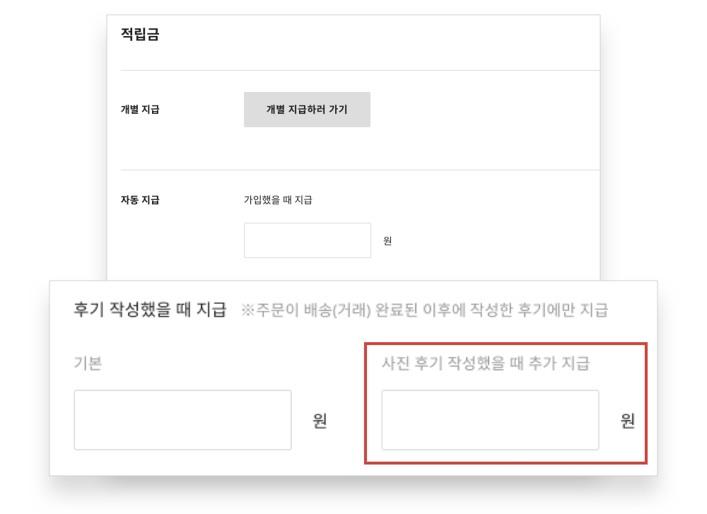 구매자가 사진이 포함된 후기를 작성했을 때 기본 지급되는 적립금에 추가 금액을 지급할 수 있습니다. 사진 후기 작성 이벤트 운영 시에 추가 적립금 기능을 활용해보세요.