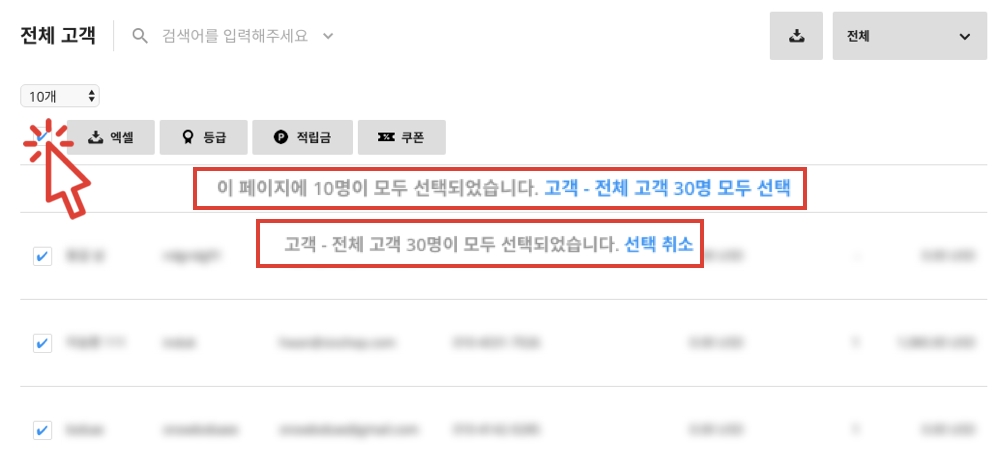 [관리하기 > 고객] 목록의 등급별 분류 화면 또는 상세 검색 결과에서 보이는 고객 전체를 선택할 수 있도록 개선했습니다. 특정 등급 고객 전체에게 쿠폰이나 적립금을 지급할 때 편리하게 사용해보세요.