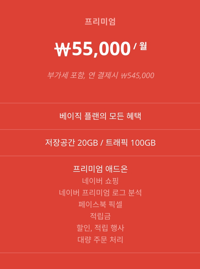 베이직 요금제보다 다양한 쇼핑몰 기능을 제공하는 프리미엄 요금제가 출시되었습니다. (적립금, 대량 주문 처리는 출시 예정입니다)