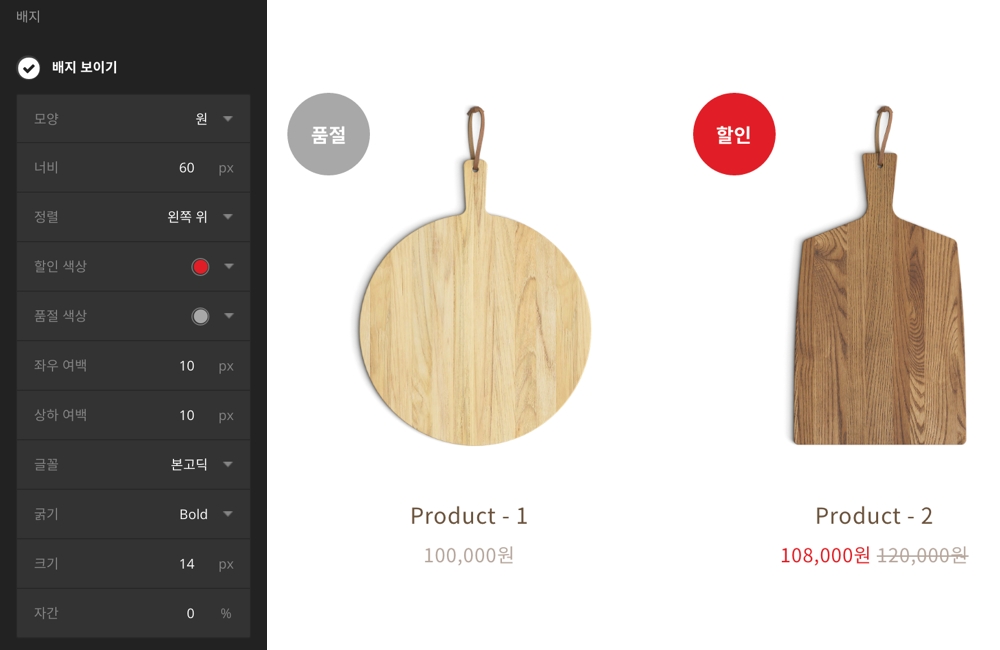 상품 목록에서 할인 중이거나 품절된 상품의 이미지 위에 배지를 추가할 수 있습니다.