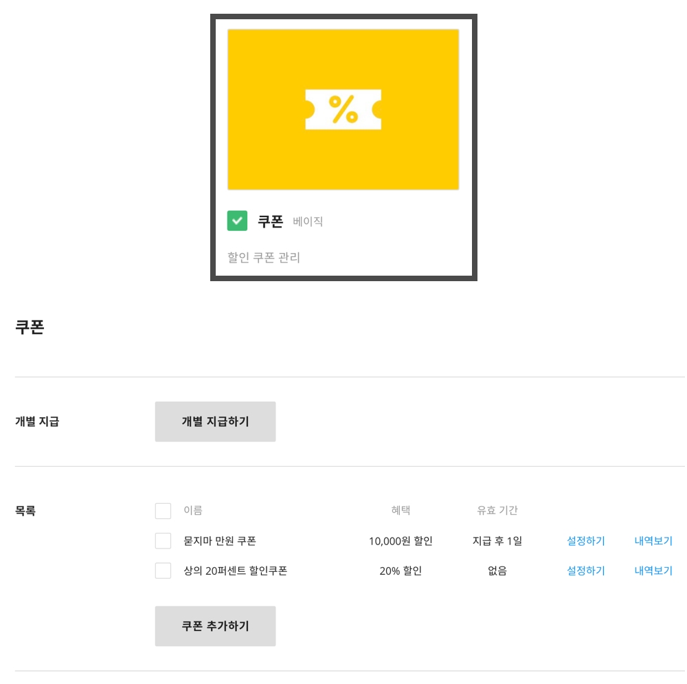 이제 쇼핑몰 구매자를 위한 쿠폰을 지급할 수 있습니다. 쿠폰 애드온은 베이직, 프리미엄 요금제에서 사용하실 수 있습니다. 수동 지급 외에 자동으로 쿠폰이 지급되는 조건은 회원 가입 시, 첫 구매 주문이 배송(거래)완료 시로 2가지입니다.