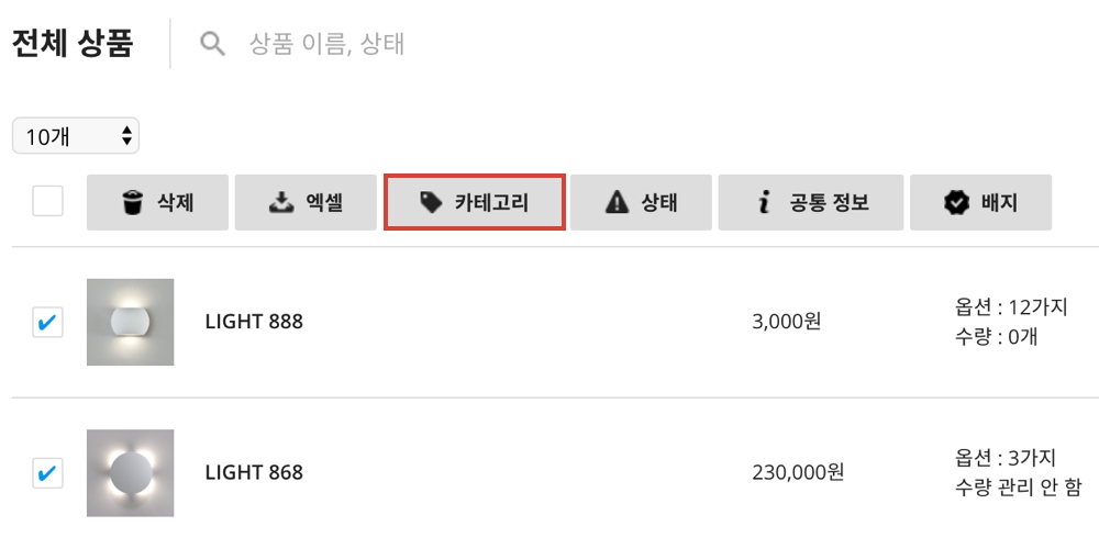 여러 개의 상품 카테고리를 일괄적으로 설정할 수 있습니다.
