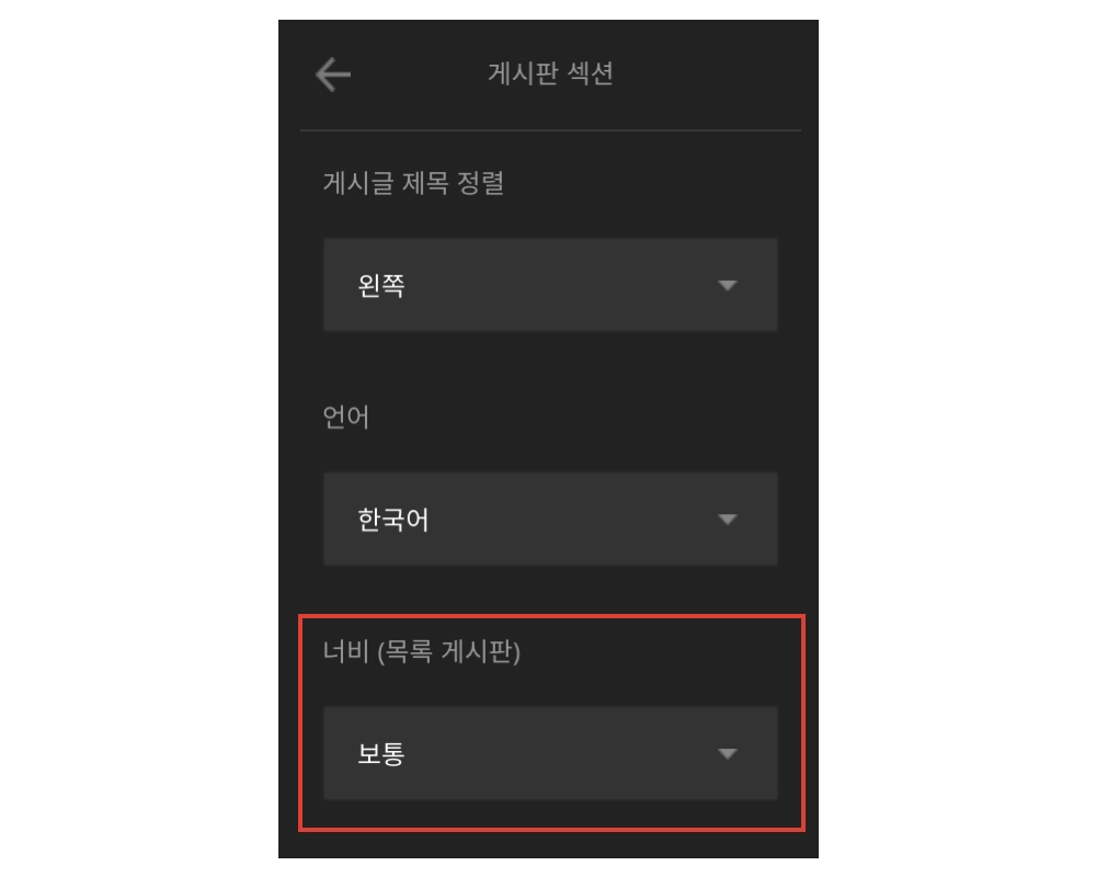 게시판 스타일 편집에서 목록형 게시판의 너비를 변경할 수 있습니다.