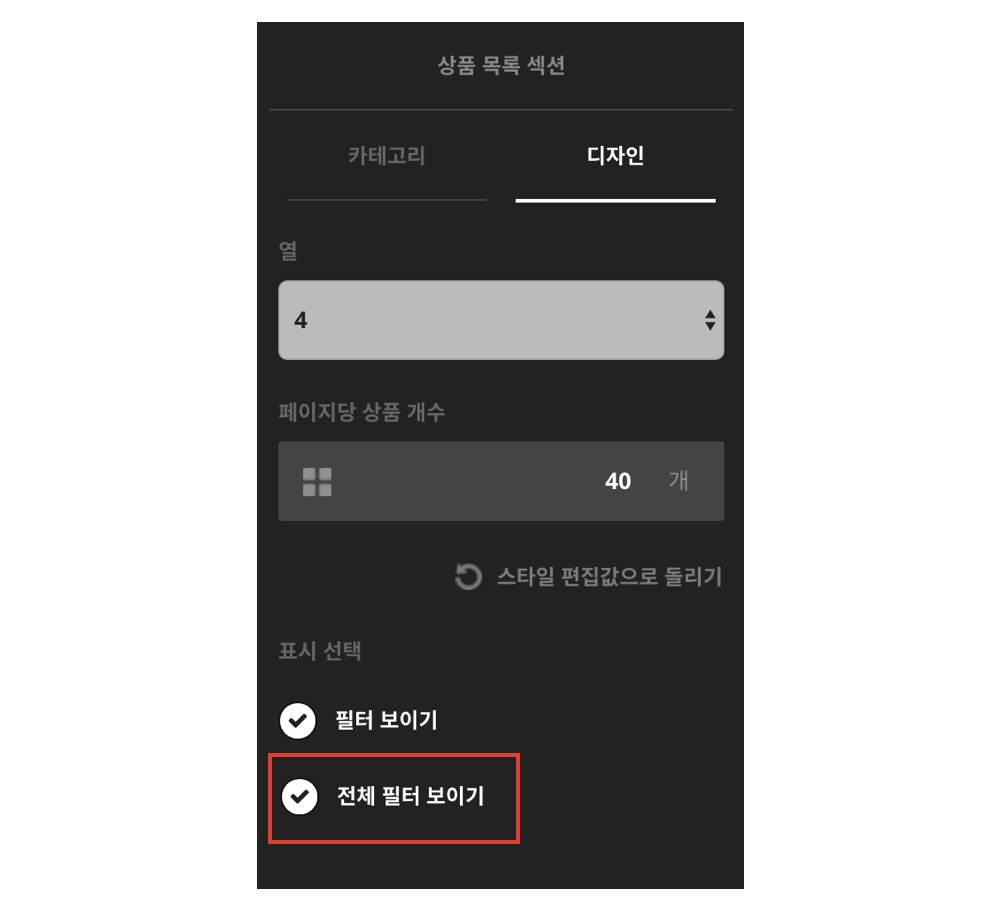 상품 목록 섹션 개별 편집 패널의 표시 선택 중 '전체 필터 보이기'가 추가되었습니다. '전체 필터 보이기' 체크를 해제하면 필터 중 전체(All) 필터가 숨겨집니다.
