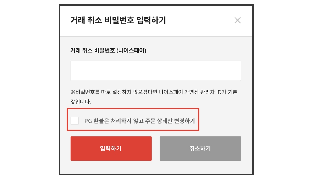 주문 상태를 취소/반품 완료로 변경할 때 'PG 환불은 처리하지 않고 주문 상태만 변경하기'를 체크하여 환불을 진행하지 않고 상태만 변경할 수 있습니다. PG사의 가맹점 관리자에서 따로 결제 금액을 취소한 경우 유용하게 활용할 수 있습니다.