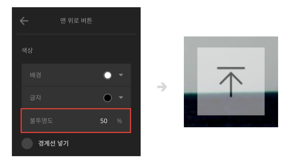 [디자인 편집 > 스타일 편집 > 맨 위로 버튼]에서 불투명도를 설정할 수 있습니다.