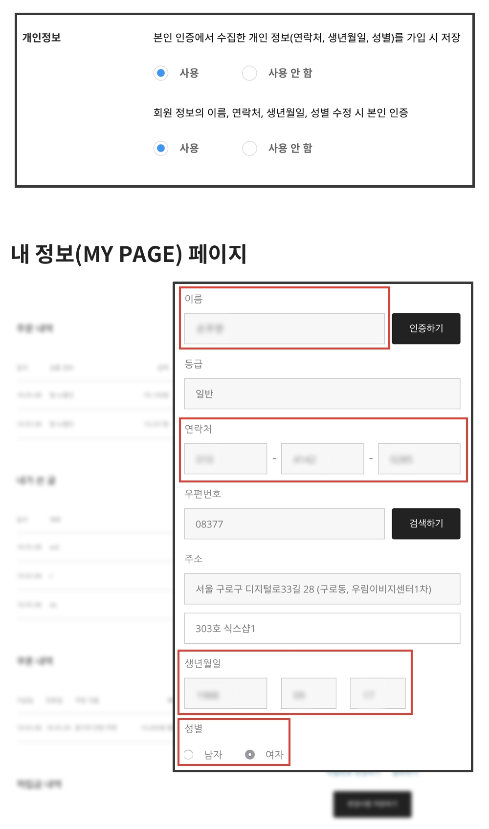- 회원 정보의 이름, 연락처, 생년월일, 성별 수정 시 본인 인증: 사이트에 로그인한 뒤 '내 정보(MY PAGE)' 페이지에서 회원 정보 중 이름, 연락처, 생년월일, 성별을 변경할 때 본인 인증을 거쳐야 합니다. 회원이 본인 인증을 거치지 않고 임의로 정보를 수정할 수 없게 됩니다.
