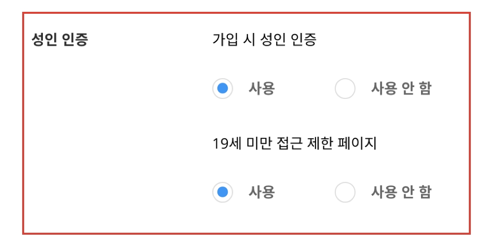 - 가입 시 성인 인증: 기존에는 19세 미만 접근 제한 페이지를 사용할 경우, 회원가입 시에는 성인 인증을 사용할 수 없었습니다. 이제 19세 미만 접근 제한 페이지의 사용 여부와 관계없이 가입 시 성인 인증을 사용할 수 있습니다.