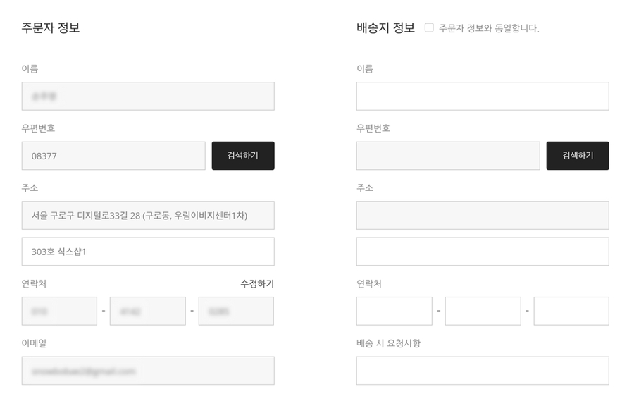 내용을 직접 입력할 수 없는 정보란의 배경 색상을 변경했습니다. 내 정보, 주문 완료 페이지 등에서 확인할 수 있습니다.