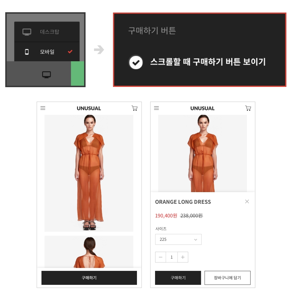 모바일에서 쇼핑몰을 이용할 때 스크롤을 내려도 구매하기 버튼을 사용할 수 있도록 사용성을 개선했습니다.