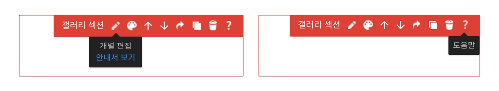 디자인 편집 도구의 섹션별 태그에 '도움말'을 추가하여 관련 안내서를 빠르게 확인할 수 있습니다.