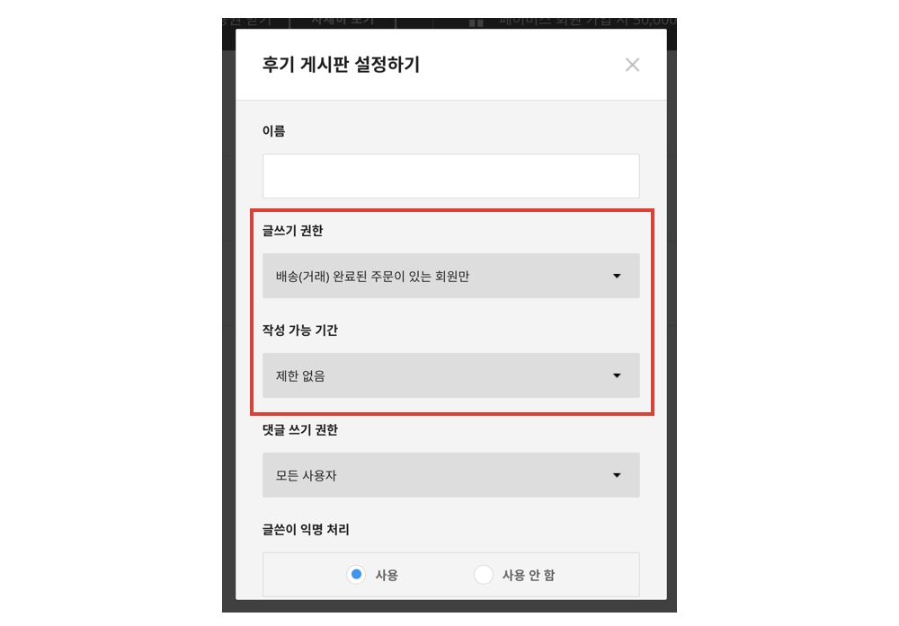 [관리하기 > 후기와 질문 > 후기 게시판 설정하기]에서 설정할 수 있습니다.