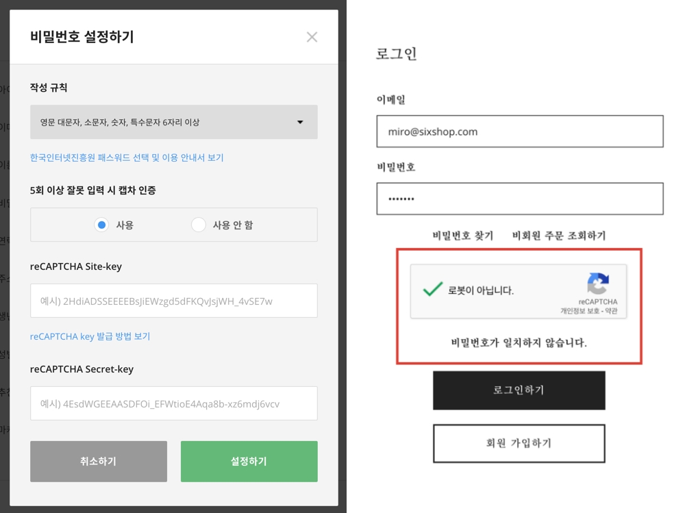 사이트 회원 가입 시 다양한 비밀번호 규칙을 설정하고, 5회 이상 잘못 입력 시 캡차로 인증할 수 있습니다.