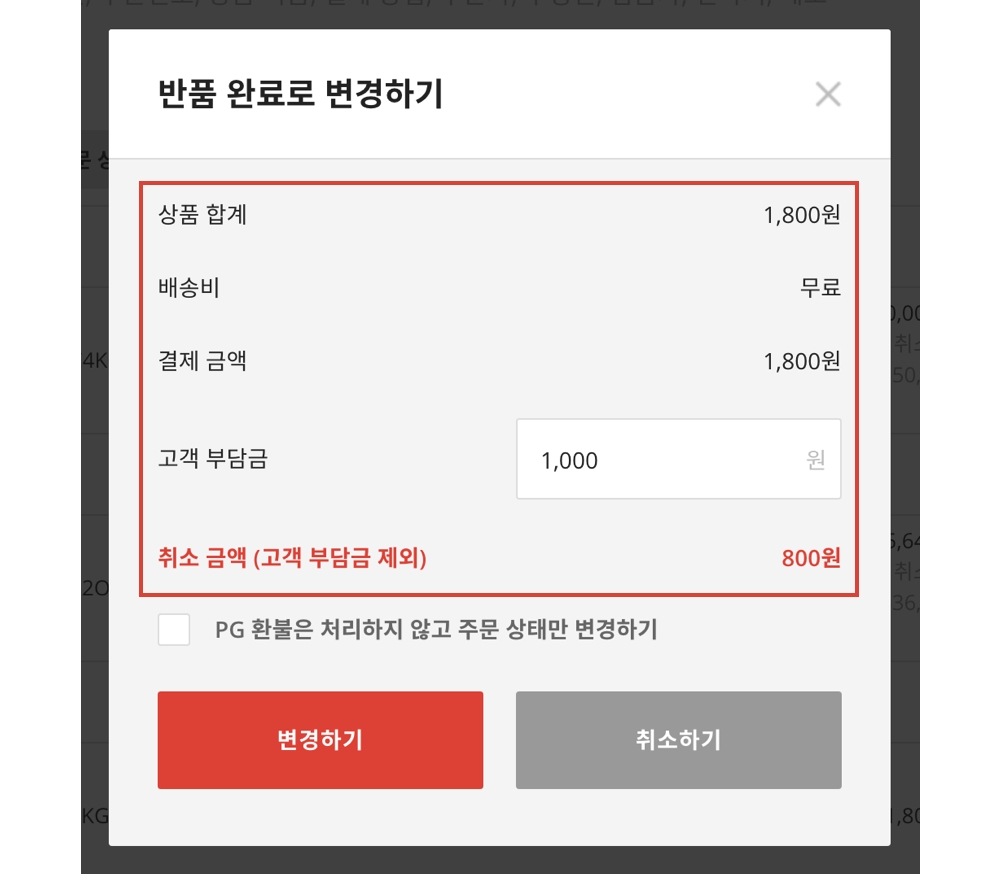반품 주문을 처리할 때 반품 배송비 처리 문제로 불편을 겪으셨던 부분을 해소하였습니다. 반품 처리 시 결제된 금액에서 고객 부담금(반품 배송비 등)을 제외한 금액을 부분 취소할 수 있습니다.