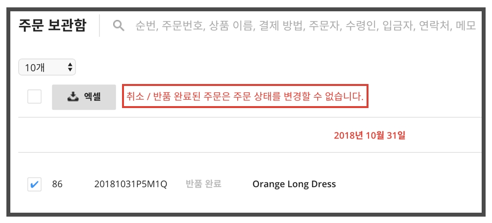 반품 부분 취소 기능이 추가되면서 반품/취소 완료된 주문을 다른 주문 상태로 변경할 때 발생하는 문제를 차단하기 위해 반품 완료, 취소 완료 처리된 주문은 다른 주문 상태로 변경하지 못하도록 수정하였습니다.