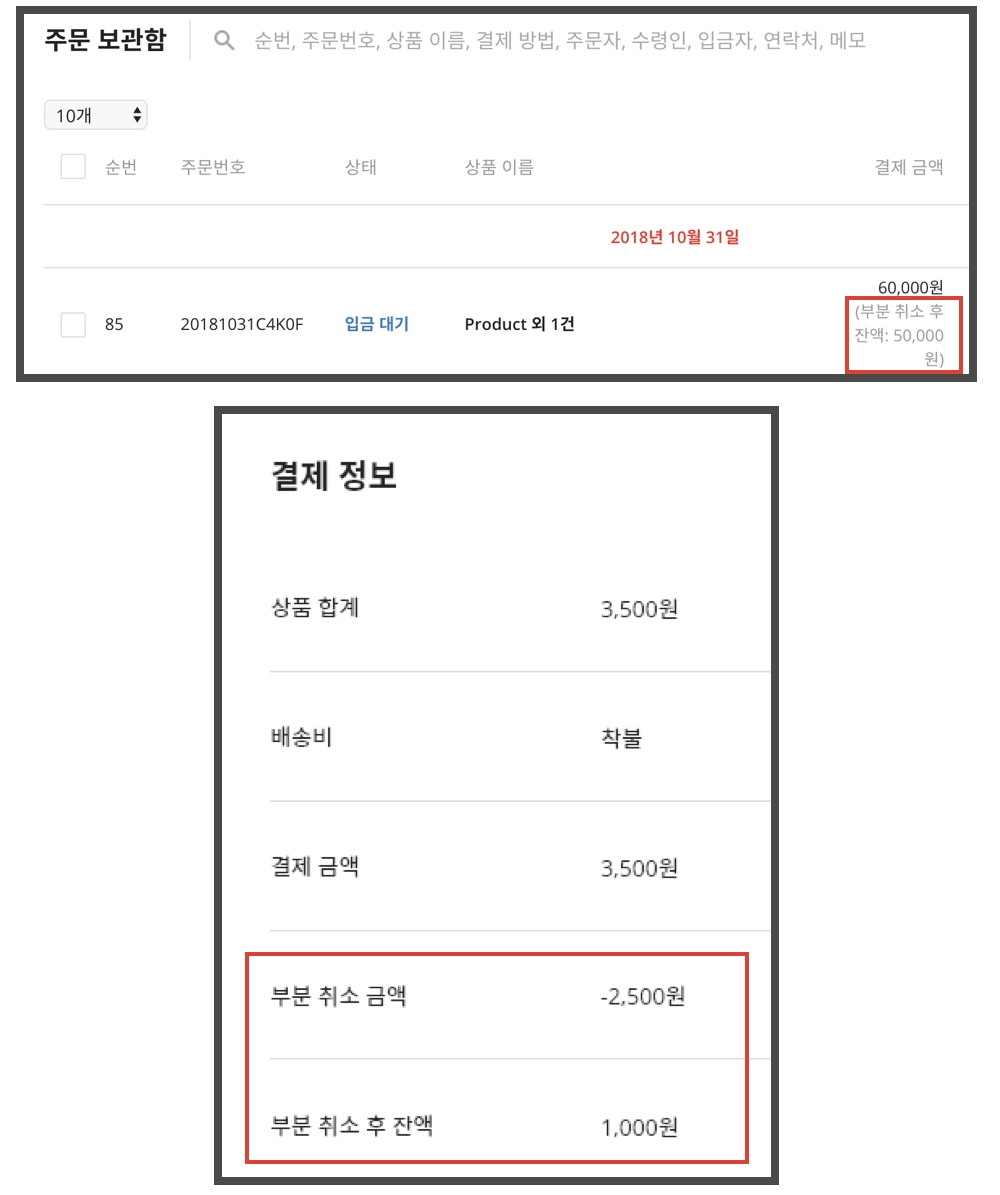상품 부분 취소 또는 반품 부분 취소를 하면 [관리하기 > 주문 목록, 주문 상세 정보]에 부분 취소 후 잔액이 표시됩니다. 관련된 변경 사항은 다음과 같습니다.