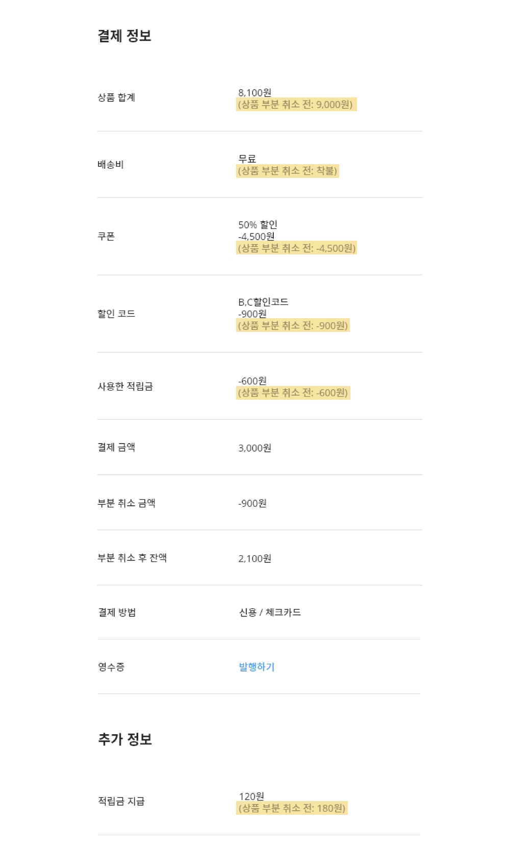부분 취소 금액 관련 변경 사항: 기존에 추가 정보에 표시되던 부분 취소 금액이 결제 금액 바로 밑으로 이동하였습니다.
