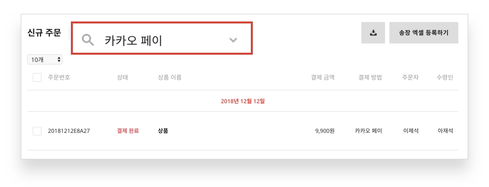 주문 기본 검색 시 '카카오 페이'를 입력하면 카카오 페이로 결제된 주문을 검색할 수 있습니다.