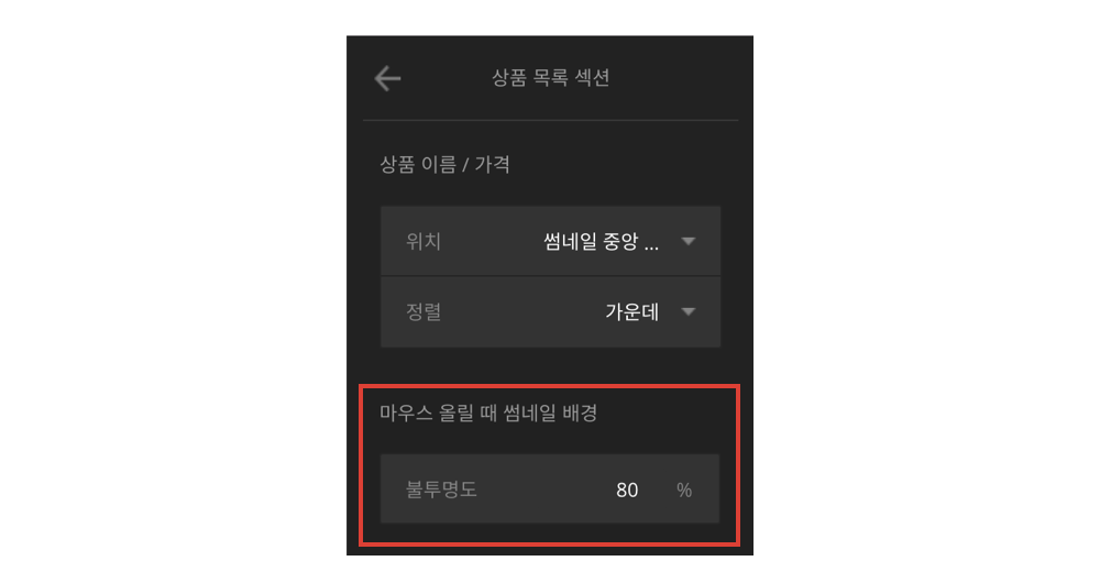 상품 목록 섹션 상품 이름 / 가격 위치가 썸네일 중앙(마우스 올릴 때)일 때, 스타일 편집 화면에서 마우스 올릴 때 썸네일 배경 불투명도를 설정할 수 있습니다.