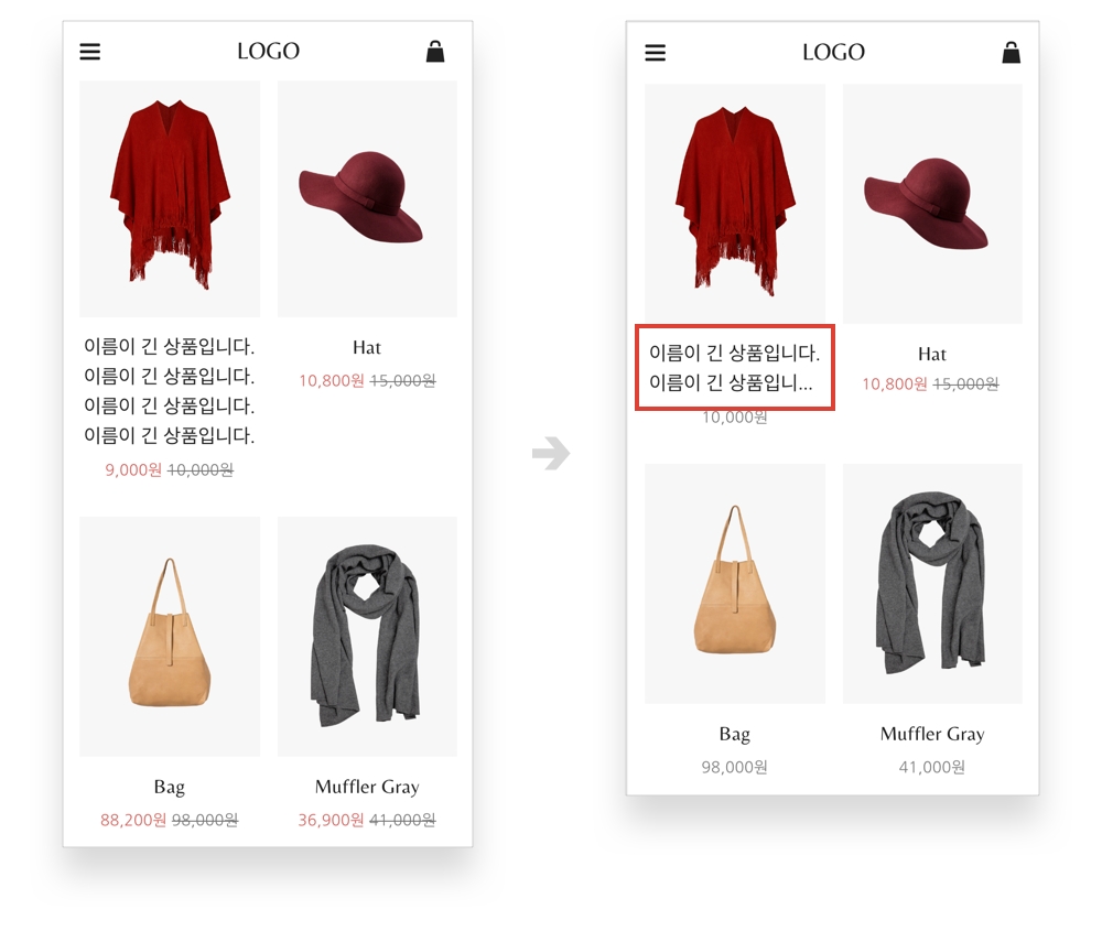 상품 이름이 길어져도 상품 목록이 가지런하게 보일 수 있도록 상품 이름이 2줄을 넘지 못하게 변경되었습니다. 상품 이름이 2줄을 넘어갈 경우 상품 이름의 끝부분이 '...'으로 보입니다.