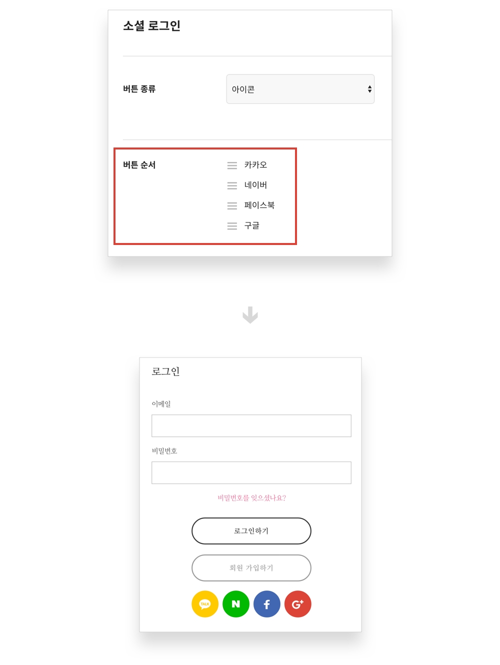 [관리하기 > 애드온 > 소셜 로그인 > 버튼 순서] 에서 사용할 수 있습니다.