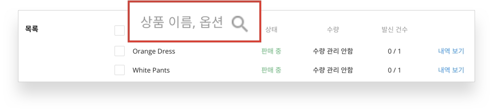 상품이나 옵션이 다양하여 발신이 불편할 때, 검색 기능을 활용하여 재입고 알림을 손쉽게 발송해보세요.
