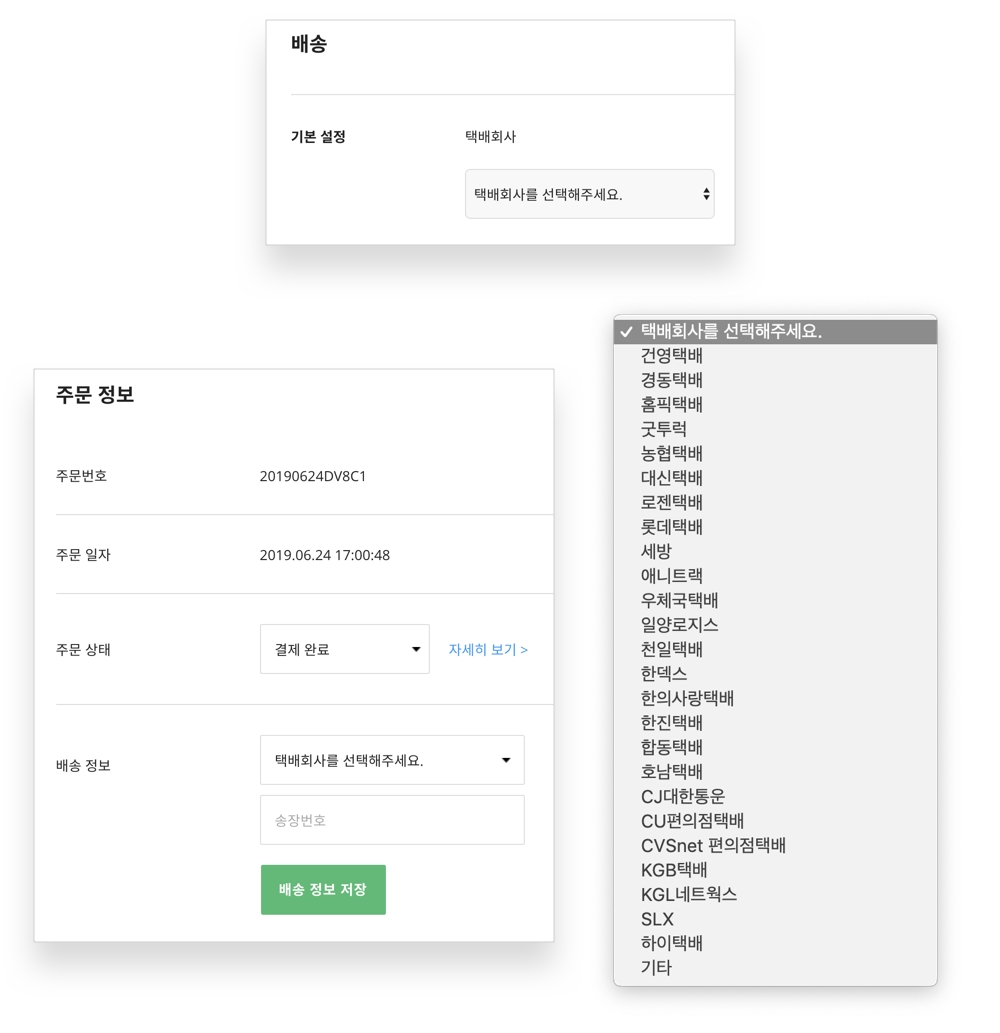 [관리하기 > 설정 > 배송]과 [관리하기 > 주문 > 주문 상세 정보 > 주문 정보]에서 택배 회사를 직접 입력하지 않고, 선택할 수 있도록 개선하여 배송 정보 오류를 예방할 수 있습니다.