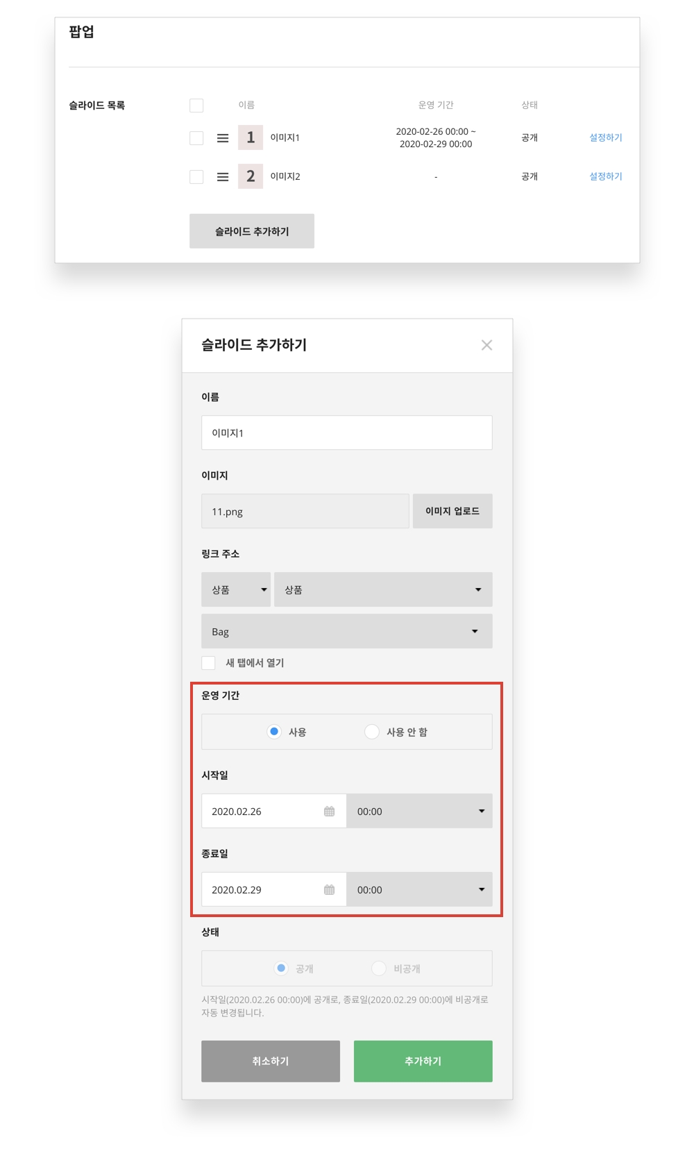 팝업 애드온을 추가 또는 설정할 때 '운영 기간'을 설정하고, 등록한 이미지를 목록형으로 관리할 수 있도록 개선했습니다. 할인 이벤트 등을 진행할 때 활용해보세요.