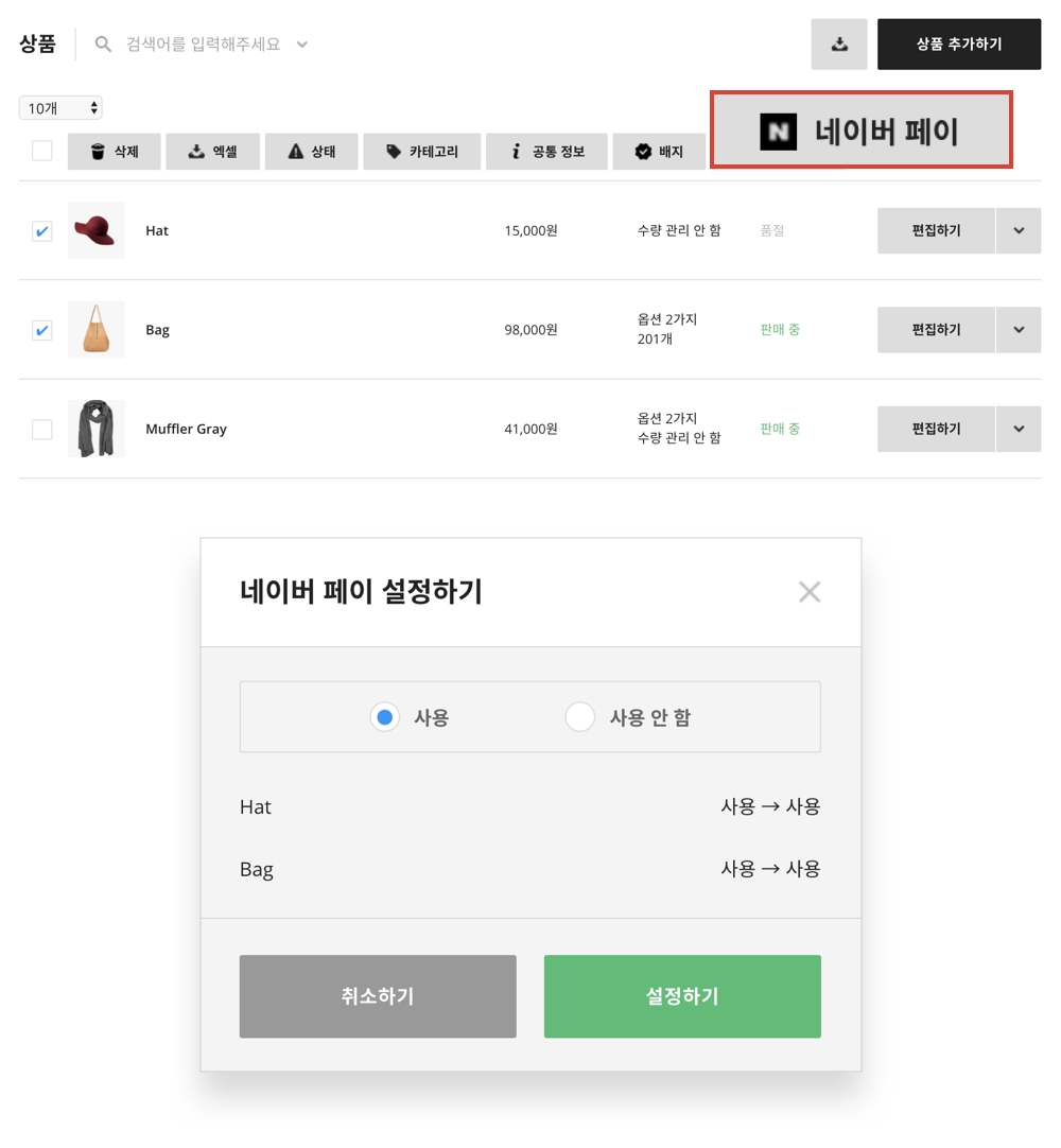 여러 개의 상품을 동시에 선택하여 네이버 페이 사용 여부를 일괄적으로 설정할 수 있습니다.