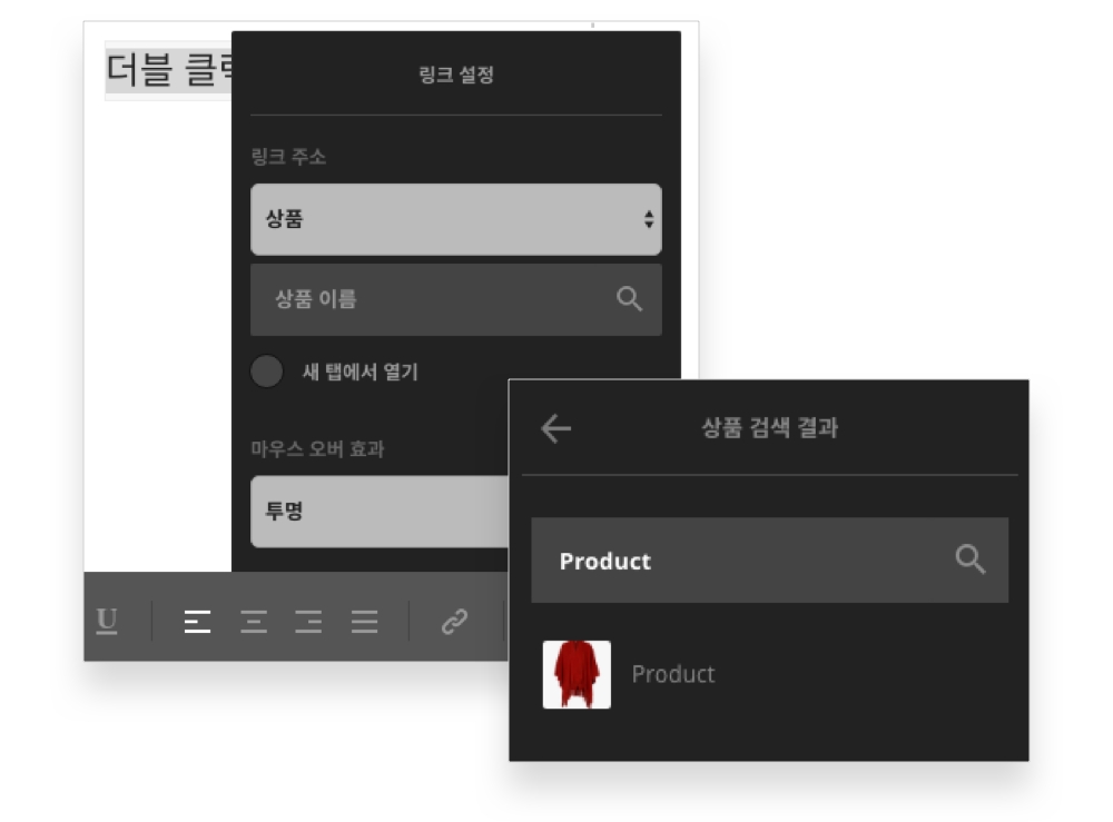 기존에는 링크를 사용할 수 있는 섹션이나 요소에서 모든 데이터를 한 번에 불러와 상품, 게시판 글 등이 많으면 디자인 편집 화면 속도가 저하되었습니다. 이제 섹션이나 요소의 링크 설정 기능을 검색 방식으로 변경하여, 디자인 편집 도구 속도 저하 현상이 개선되었습니다. 또한 상품, 게시판 글 등을 스크롤로 찾아 설정하는 불편함도 해소되었습니다.