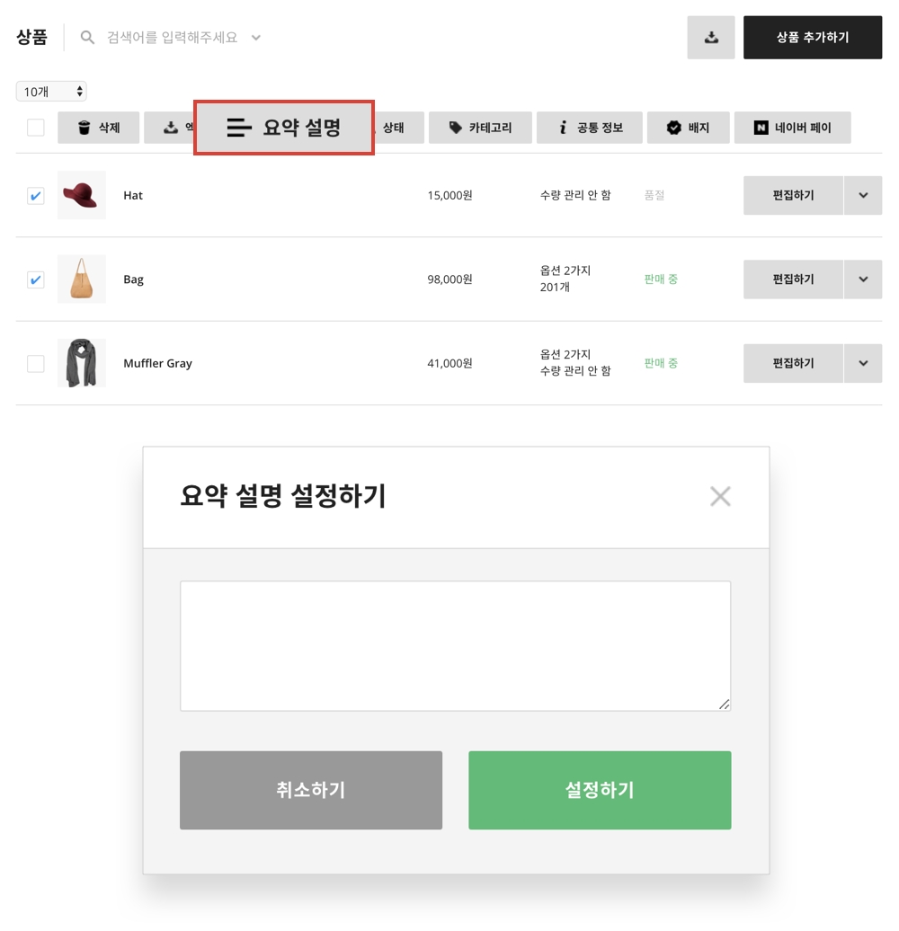 여러 개의 상품을 동시에 선택하여 요약 설명을 일괄적으로 설정할 수 있습니다.